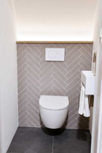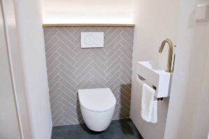 Voor deze toiletverbouwing hebben we een moderne en strakke uitstraling gerealiseerd door hoogwaardig stuc- en tegelwerk. De achterwand is voorzien van een elegant grijs visgraatpatroon, gecombineerd met een houten plank en subtiele LED-verlichting dat direct de aandacht trekt en een luxe uitstraling geeft. De vloer is afgewerkt met grote donkergrijze 60 x 60 tegels, die een robuuste en tijdloze basis vormen.